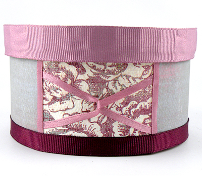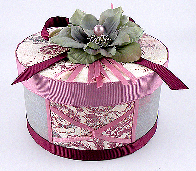 - Glue a piece of the pink and wine colored ribbon around the side of the lid and bottom edge of the box. Attach two pieces of 1/8 wide ribbon to the front of the box and interlock and form an X. Finish the edges of the front accent paper with ribbon on each side of the X.