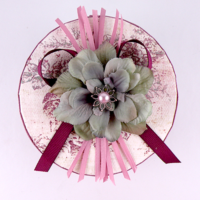 - Make a bow with the wine colored ribbon and attach to the top of the box. Wrap 6 loops of the 1/8 wide ribbon together, tie in the center and glue to the top of the box lid. Cut the loops of the 1/8 inch wide ribbon loops to form a fringe.