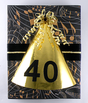 This is a gift I wrapped for a friend’s 40th birthday. I like to incorporate part of the recipient’s interests into my gift wrap to give it that personal touch. The birthday guy loves music so I used a fun musical note scrapbooking paper to set the tone of the wrap. I reused a birthday hat and pieces of ribbon leftover from the holidays to accent the gift. It has a 3D effect that may not be apparent in the picture.